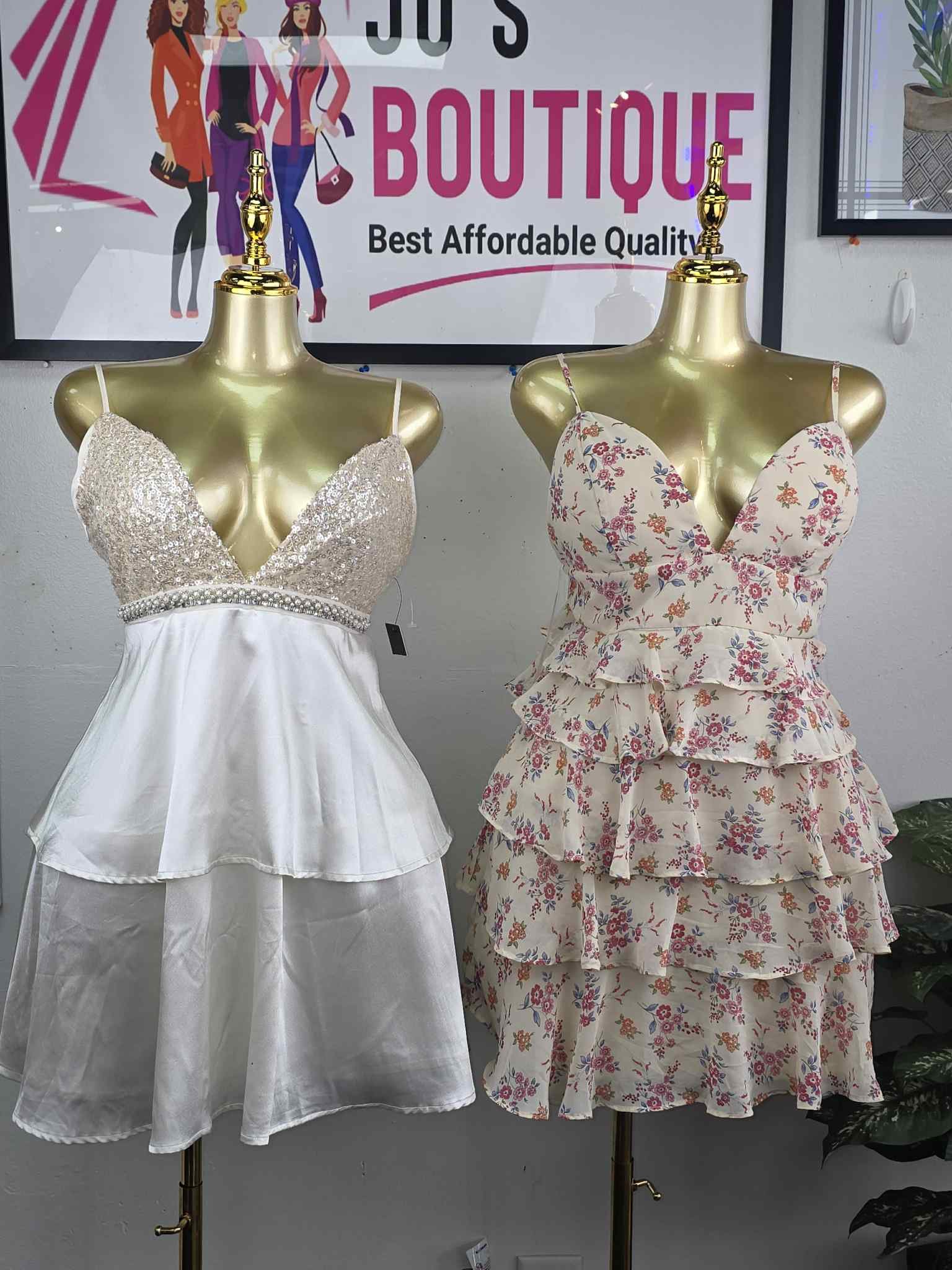 • Fabric/Texture: The white version features a sequin-covered mesh bodice and silky layered ruffles. The floral version is a light, airy chiffon-like fabric with a delicate floral print.