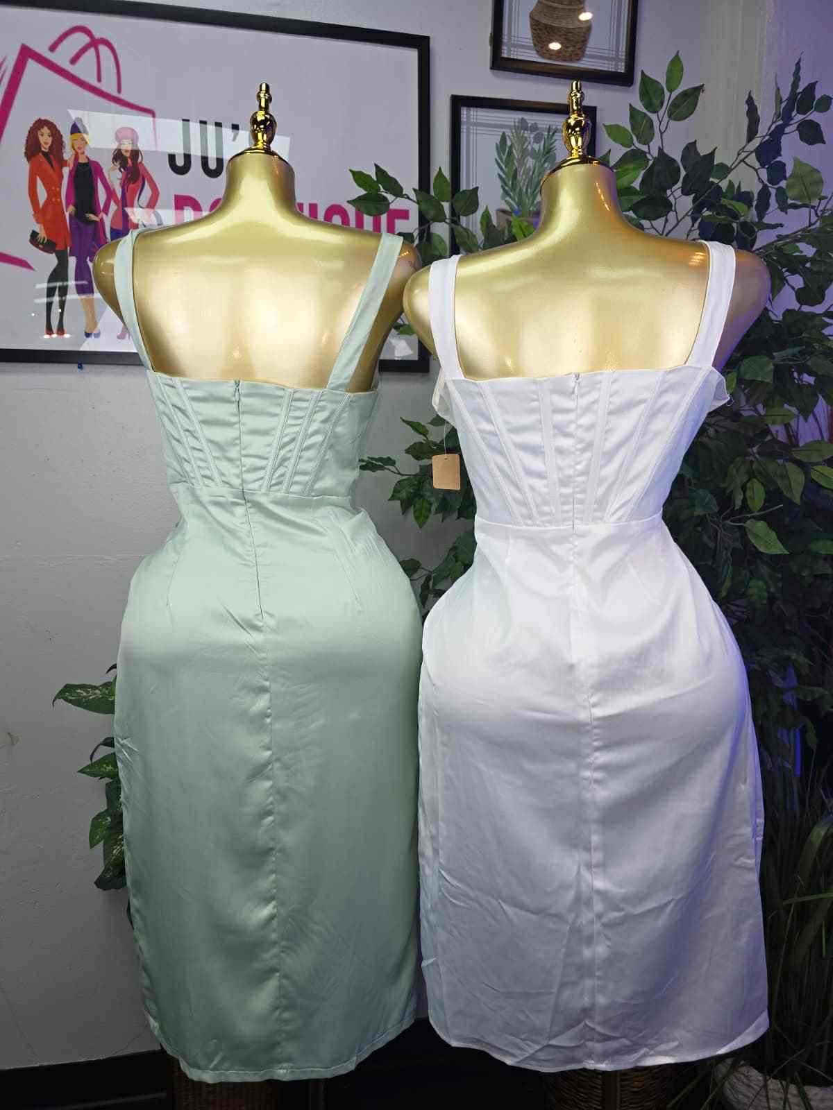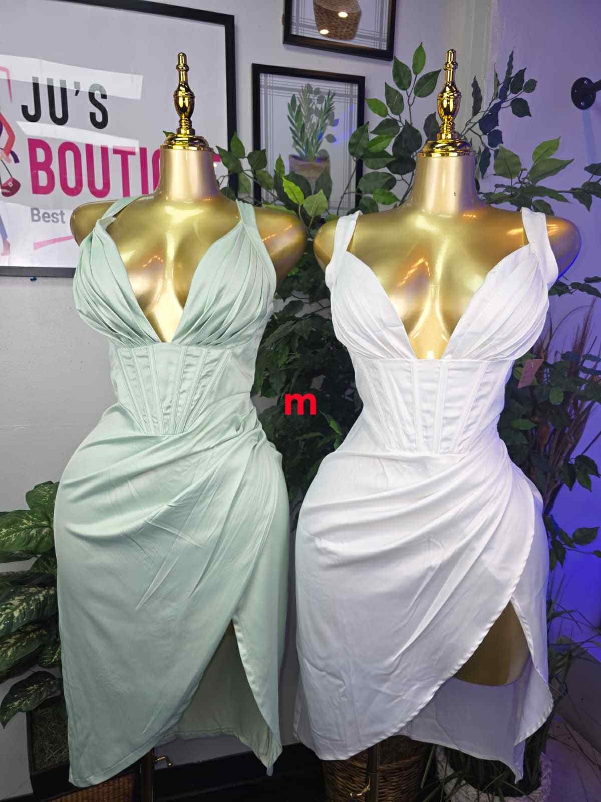- Design Details: The standout feature is the structured, corset-style bodice which cinches the waist and provides an hourglass shape. The top is complemented by delicate ruching and a deep, plunging V-neckline, offering a touch of alluring sophistication.