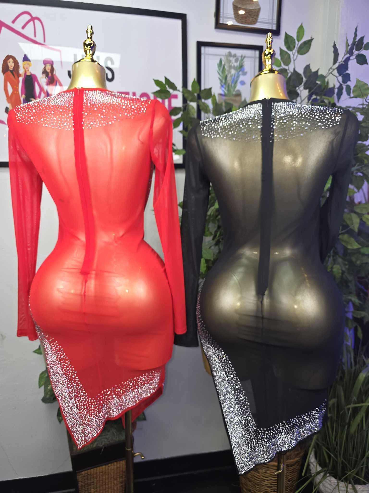 - Design Details: This long-sleeve mini dress features a dramatic asymmetrical hemline and is crafted from a sheer, mesh fabric with all-over sparkle or rhinestone embellishments. The bodice is styled like a bustier, with a structured sweetheart neckline and underwire detailing for support and shaping.