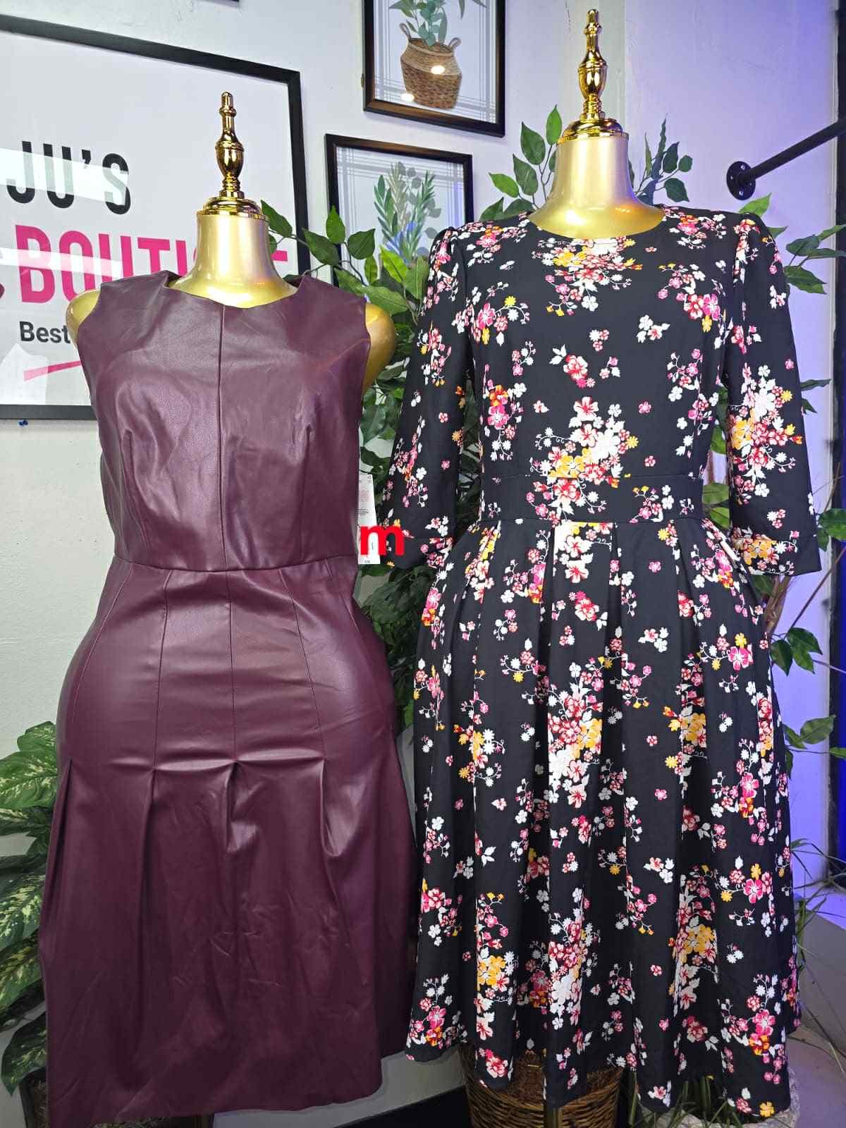 A modern, edgy take on the classic A-line silhouette. This sleeveless midi dress is crafted from a faux leather material in a deep, rich plum or burgundy color. It features a simple crew neckline and a fitted bodice that flows into a flared skirt with gentle pleating for structure and movement. This piece is perfect for adding texture and drama to your wardrobe.