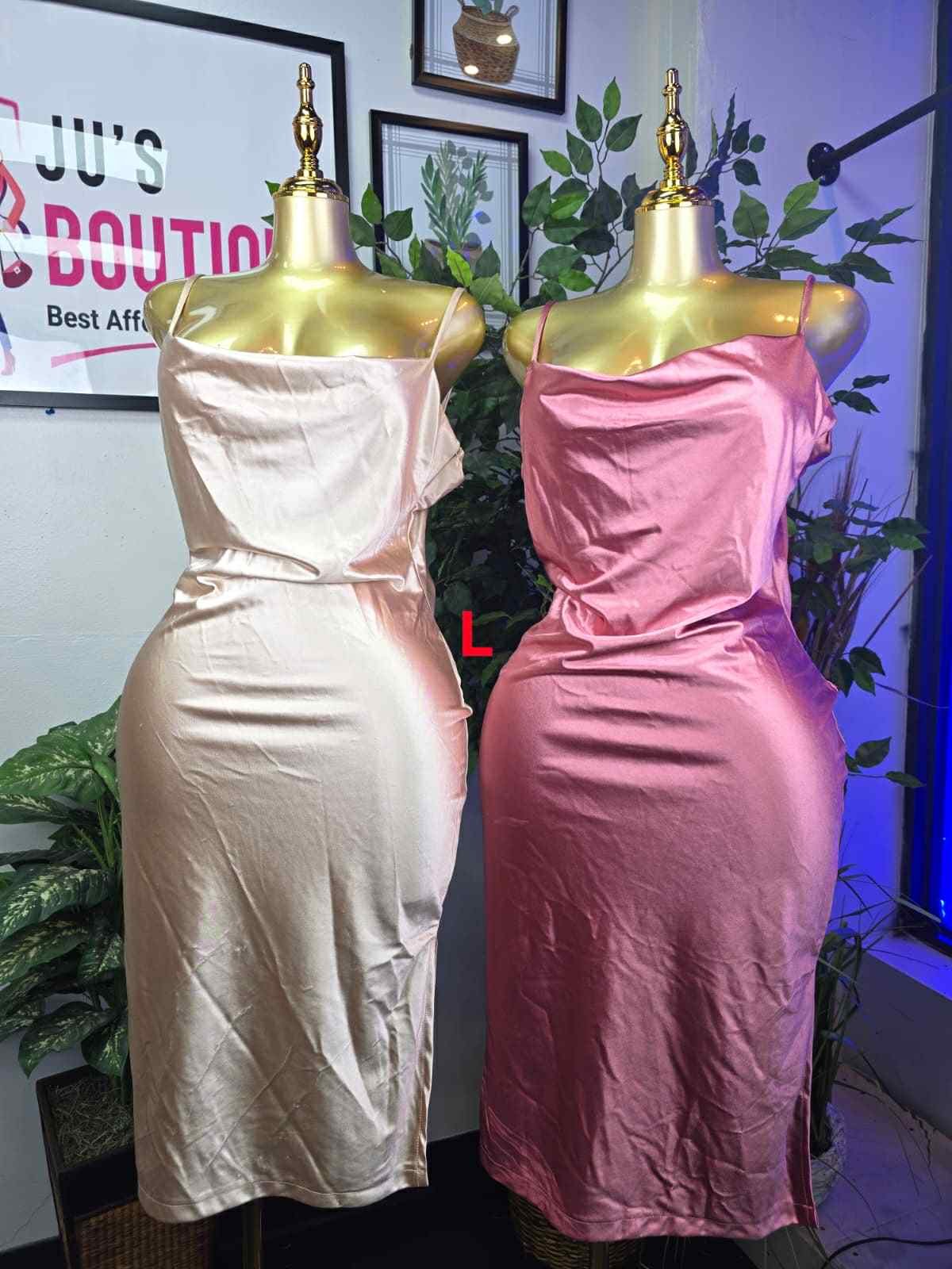 - Brief Description: These are long, fitted slip-style dresses with a slightly shiny, satiny finish. They feature thin spaghetti straps and a draped neckline, often called a cowl neck. They appear to be body-con or sheath style, following the figure closely.