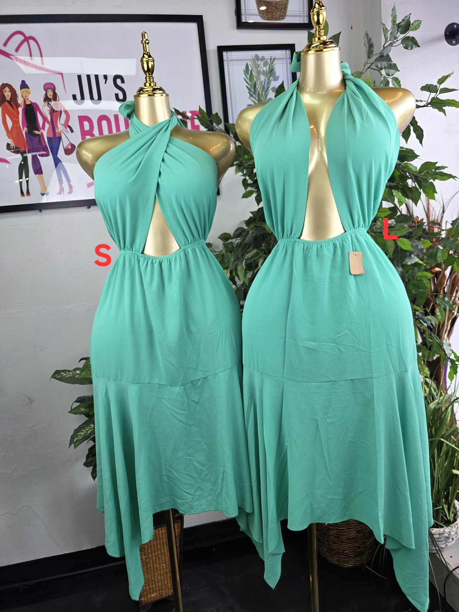 Featuring a bold twisted halter neckline and a daring front cutout that shows just the right amount of skin. The flowy skirt makes this the ultimate dress for tropical vacations, summer events, or any glamorous night out.