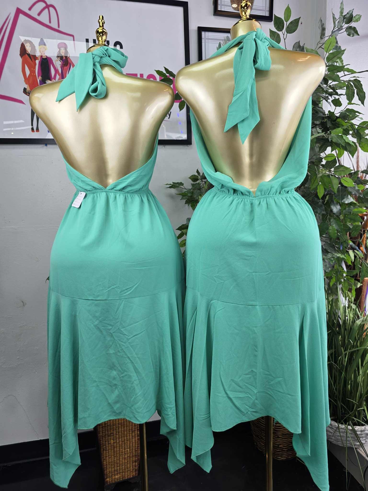 • Dramatic Halter Neckline: Features a wide, criss-cross or twisted halter neck that ties behind the neck, offering both support and style.