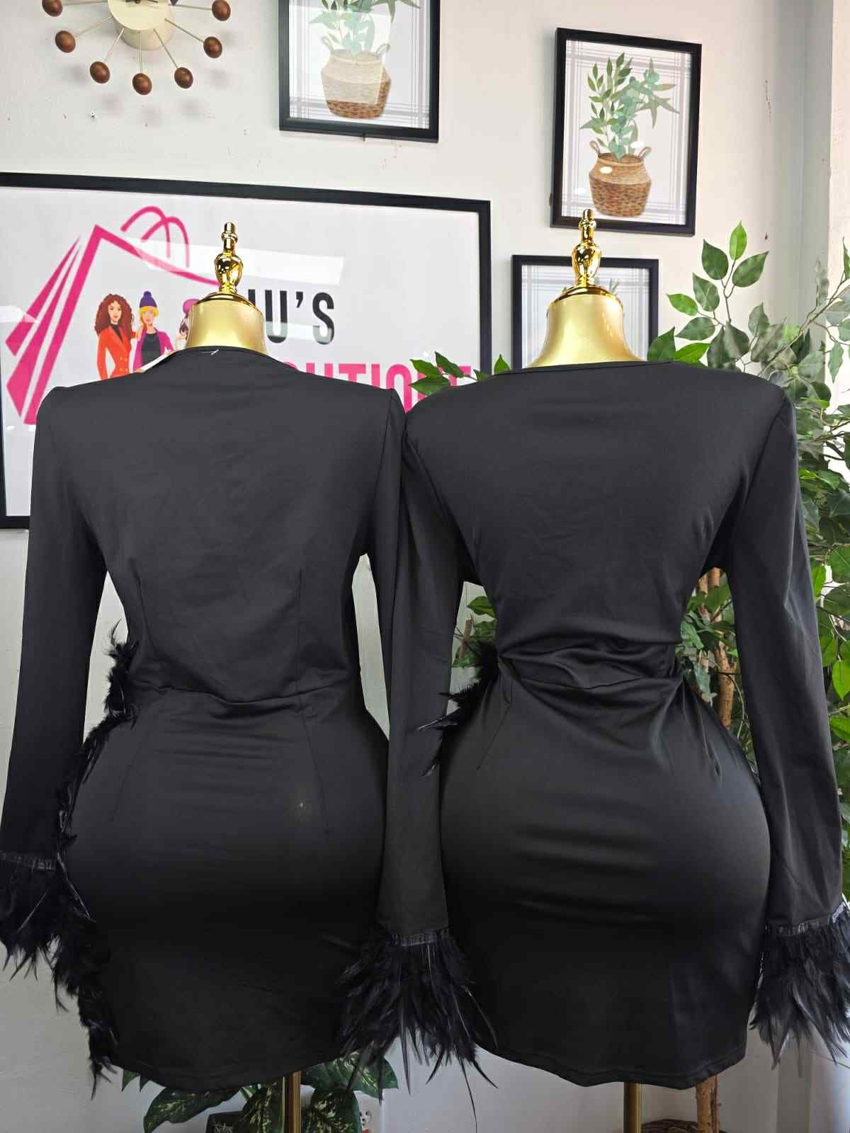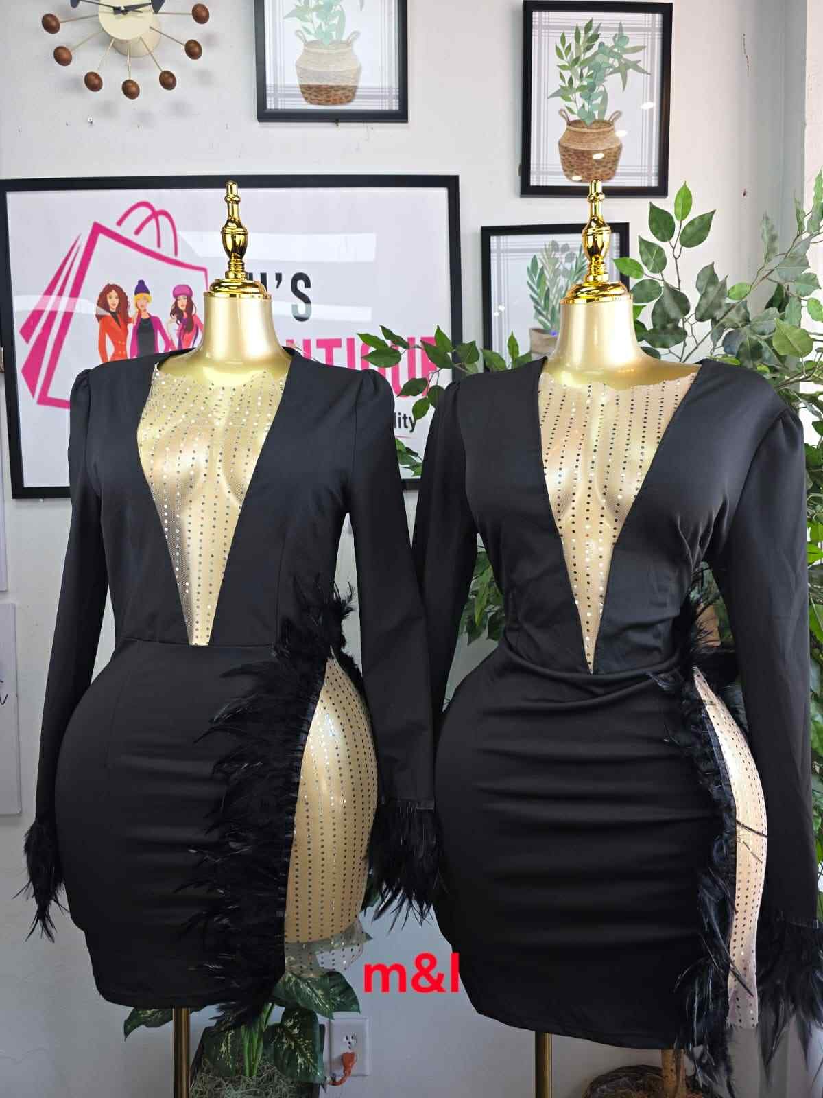 Unleash your inner star in the show-stopping Black Swan Mini. This sophisticated black dress commands attention with its dramatic features. It boasts a plunging deep V-neckline with a sheer, rhinestone-embellished mesh panel for dazzling sparkle. The look is finished with dramatic feather trim along the hips/sides and cuffs, adding a luxurious, textured movement. The long sleeves and mini length create the perfect party silhouette.